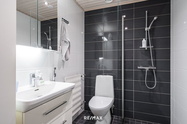 - WC-istuin, suihku, suihkuseinä, pesukoneliitäntä, peilikaappi, pesuallas, allaskaappi, bidee-suihku, ja patteri