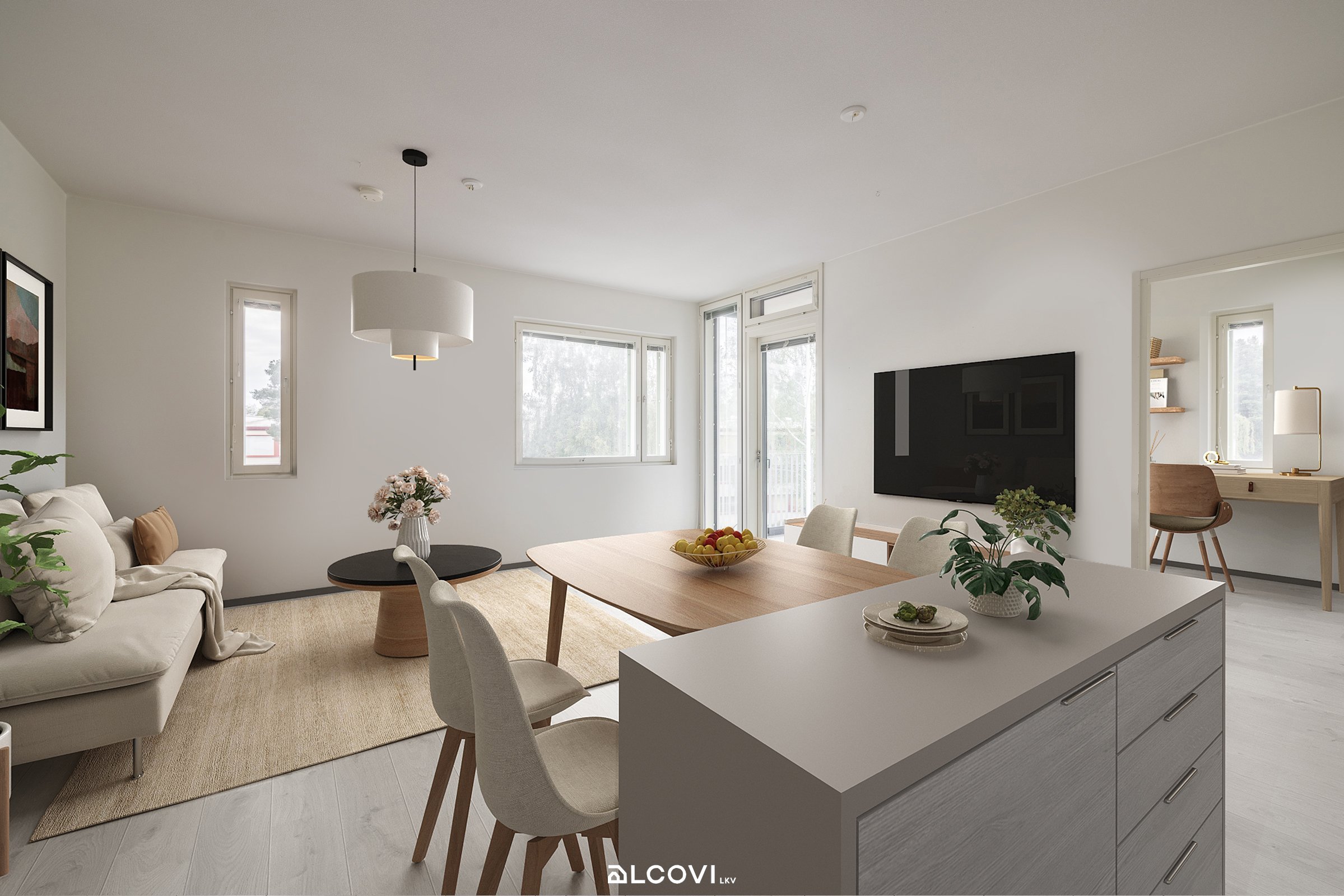 Tervetuloa tutustumaan tähän siistikuntoiseen, toimivalla pohjaratkaisulla varusteltuun 4. kerroksen kotiin, jossa vaaleat pinnat ja mainio tilankäyttö viehättävät. Huoneisto on varusteltu kattavasti, muun muassa keittiö saarekkeineen on vallan käytännöllinen kokonaisuus, ja säilytystiloja löytyy runsain mitoin vaaleista kiintokaapistoista. Katettu parveke on mukava lisä asumiseen. Ajattomin materiaalein viimeistellystä kylpyhuoneesta löytyy paikkansa sekä peseytymiseen että pyykkihuoltoon. Koko huoneiston kattava vesikiertoinen lattialämmitys ja koneellinen ilmanvaihto tukevat asumisviihtyvyyttä osaltaan.