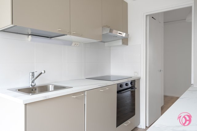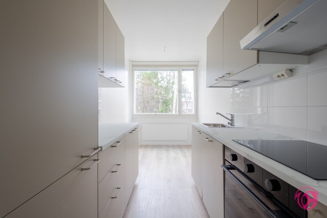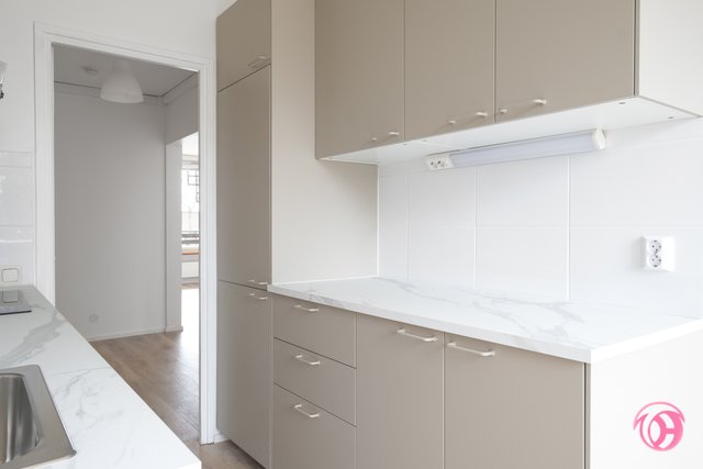 - Juuri uusittu keittiö kaapistoineen ja kodinkoneineen, hyvät säilytystilat ja työtasot. Samalla uusittiin seinä- ja lattiapinnat. Tilaan sopii hyvin ruokailuryhmä.