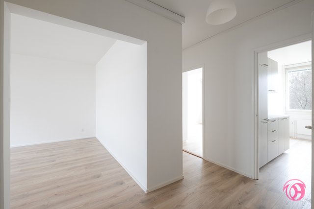 - Tilava eteinen, jossa on kaksi erillistä kaapistoa. Seinät on juuri maalattu ja uusittu laminaattilattia..
