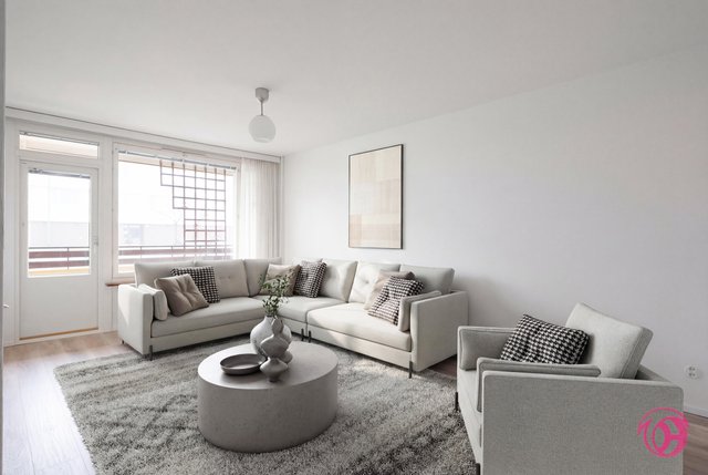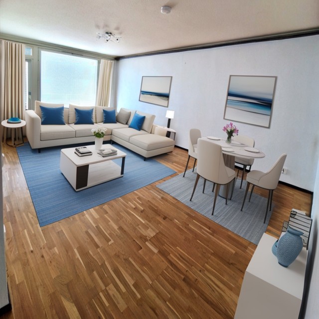 - Valoisa olohuone. Tila on jaettavissa olohuone-, ruokailu- tai työtilaksi. Seinät on juuri maalattu ja uusittu laminaattilattia.
