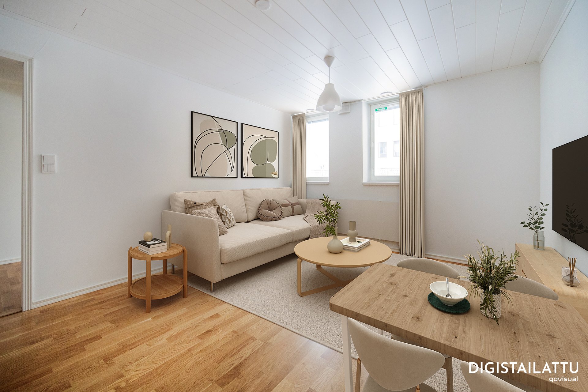 Huoneisto on tyylikkäästi saneerattu v.2019-2020. Olohuone ja keittiö yhdistyvät saumattomasti yhtenäiseksi avaraksi oleskelutilaksi. Valkeat seinät, vaaleanharmaat kaapistot ja massiivipuutasot yhdistettynä tammiparkettilattian kanssa luovat klassisen, ajattoman ilmeen. Makuuhuoneessa on runsaasti kaappitilaa liukuovien takana. Nykyaikainen kylpyhuone on varustettu kestävällä kivitasolla, käännettävillä suihkuseinillä, lattialämmityksellä ja pesukoneliitännällä. Eteisessä on käytännöllisesti kaunista, isoa lattialaattaa.