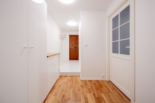 - Tammiparkettilattiat, eteisessä osittain kaunis valkea laattalattia.