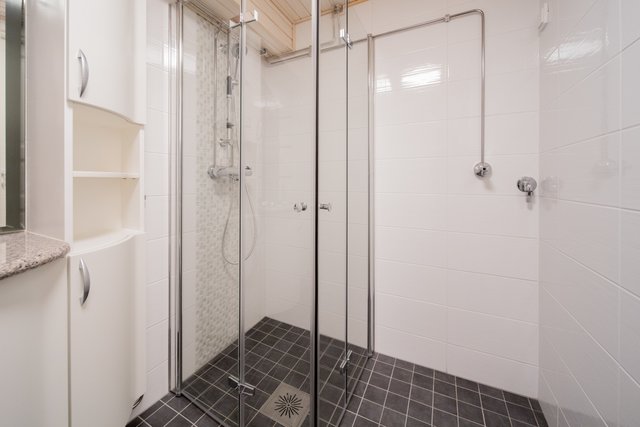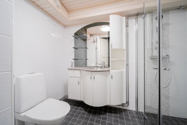 - Nykyaikainen vuonna 2019-2020 remontoitu kylpyhuone, jossa on harmaat ja valkeat kaakelipinnat. Remontin yhteydessä tehty suihkutilalle ja pyykinpesukoneelle laajennus. Taitettavat suihkuseinät suojaavat roiskevedeltä. Hyvä allaskaluste, jossa kestävä kivitaso.