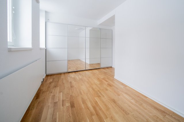 - Siisti makuuhuone, jossa on hyvin kaappitilaa liukuovien takana.