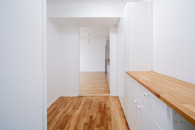 - Vuonna 2019-2020 remontoitu keittiö, jossa on vaaleanharmaan sävyiset kaapistot sekä massiivipuutasot. Laatikostot ja kaapinovet on varustettu hidastimilla. Kattava kodinkoneistus.