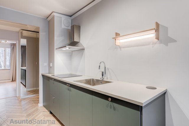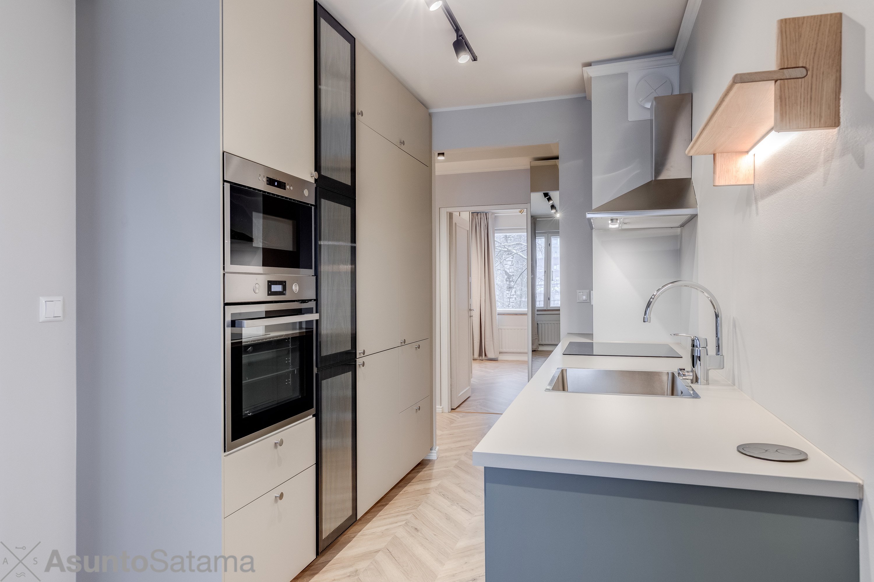 Huoneiston seinät on maalattu neutraaleihin sävyihin, lattia on kaunis kalanruotolaminaatti, tyylikäs valaistus luo tunnelmaa. Upouusi moderni keittiö on varustettu laadukkailla materiaaleilla, sekä kodinkoneilla. Kylpyhuone on remontoitu taloyhtiön putkiremontin yhteydessä vuonna 2013. Asunnon parveke tarjoaa mukavan paikan rentoutua ja nauttia kaupunkimaisemasta.