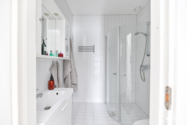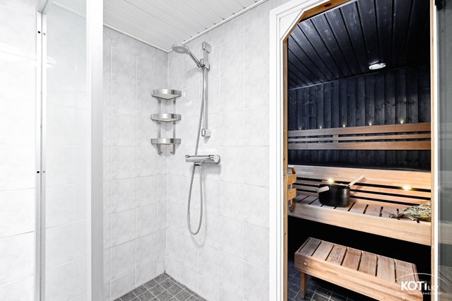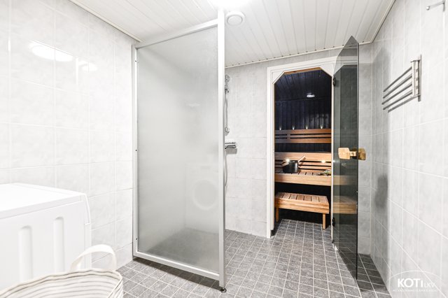 - 2 x kylpyhuone. Alakerran kylpyhuoneen varustus: suihku, suihkuseinä, pesukoneliitäntä ja lattialämmitys. Lattiamateriaali: laatta. Seinämateriaali: kaakeli. Yläkerran kylpyhuone varustus: suihku, suihkuseinä, wc-istuin, allas ja peilikaappi. Lattiamateriaali: laatta. Seinämateriaali: kaakeli.