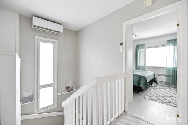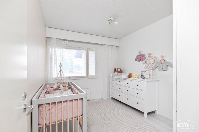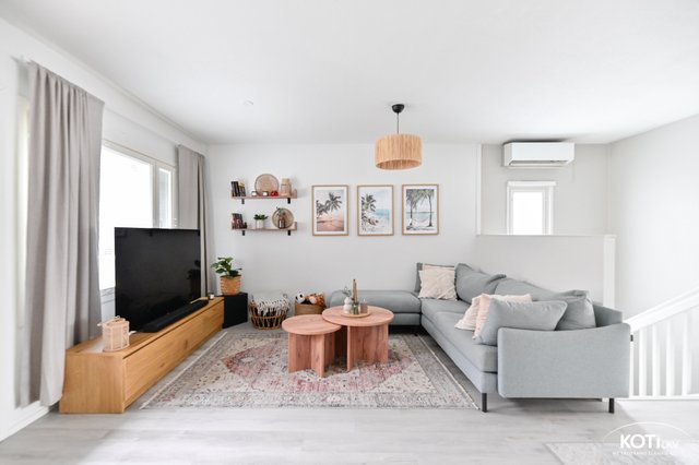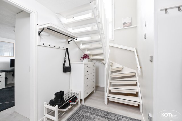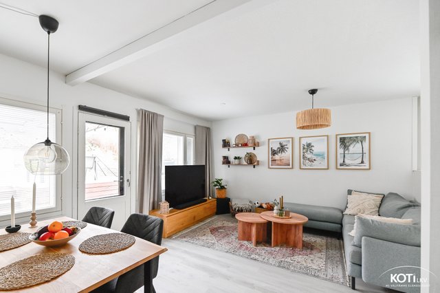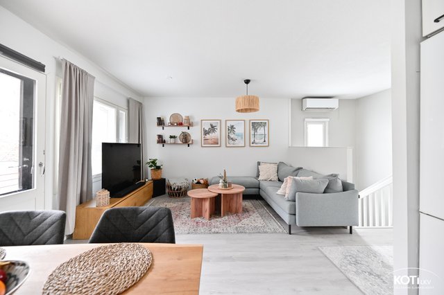 Yläkerran valoisa olohuone – ruokailutila ja v. 2019 uusittu tyylikäs avokeittiö muodostavat avaran kokonaisuuden. Lisäksi yläkerrassa on kaksi makuuhuonetta lisää ja toinen kylpyhuone. Huoneet ovat selkeät sekä helposti sisustettavat ja pohjaratkaisu sopii hyvin perheelle tai pariskunnalle.