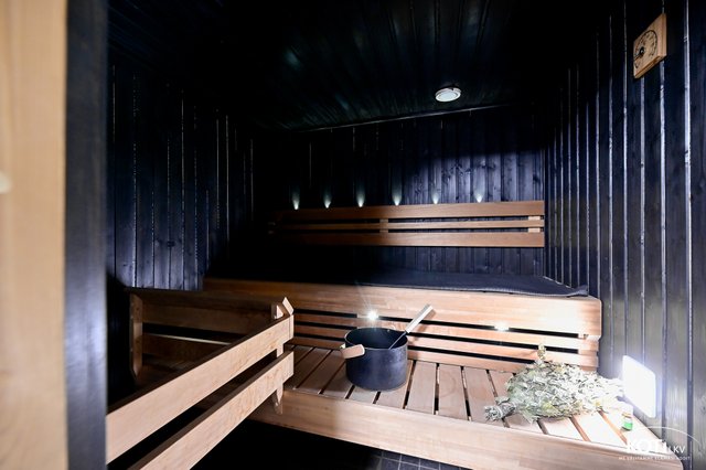 Sisääntulokerroksessa on kaksi huonetta, erillinen wc, saunaosasto sekä varasto heti ulko-oven vieressä.