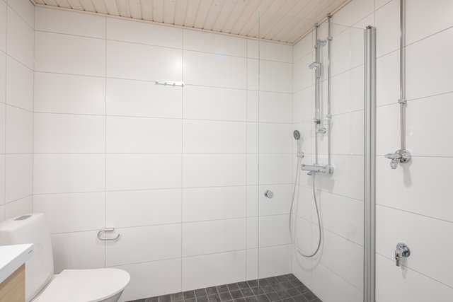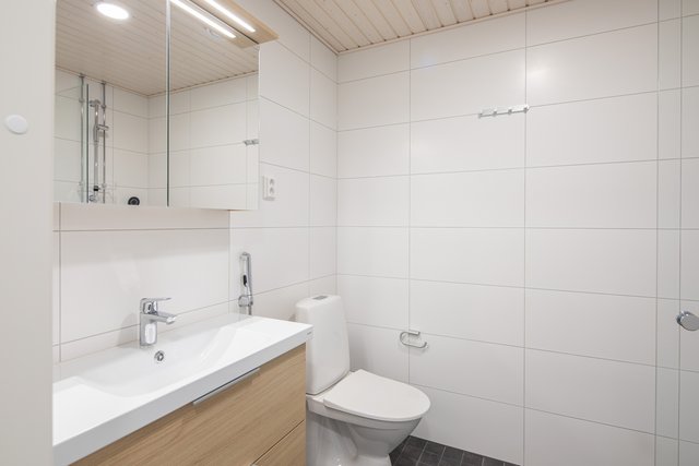 - WC-istuin, suihku, suihkuseinä, pesukoneliitäntä, lattialämmitys, allaskaappi, pesuallas, peilikaappi, ja bidee-suihku