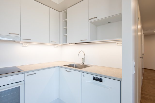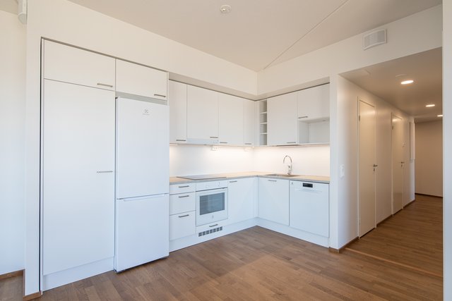 - Electroluxin kodinkoneet, Novartin kaapistot, Lapetek Luna X500 RST-allas, Oras Vega -keittiöhana, välitilassa Led-nauha, laminaattitaso (vaalea terrazzo).