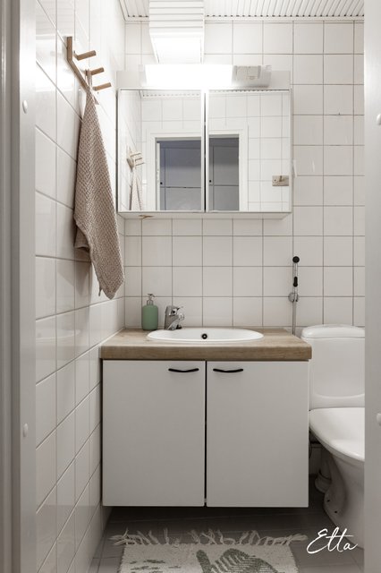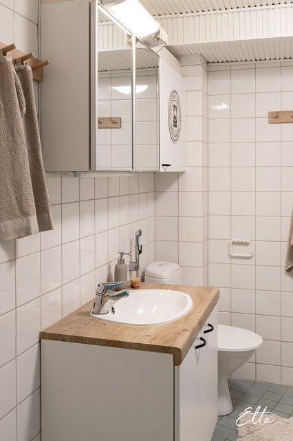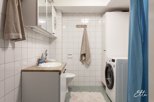 - WC-istuin, suihku, pesukoneliitäntä, lattialämmitys, peilikaappi, pesuallas, allaskaappi, ja bidee-suihku