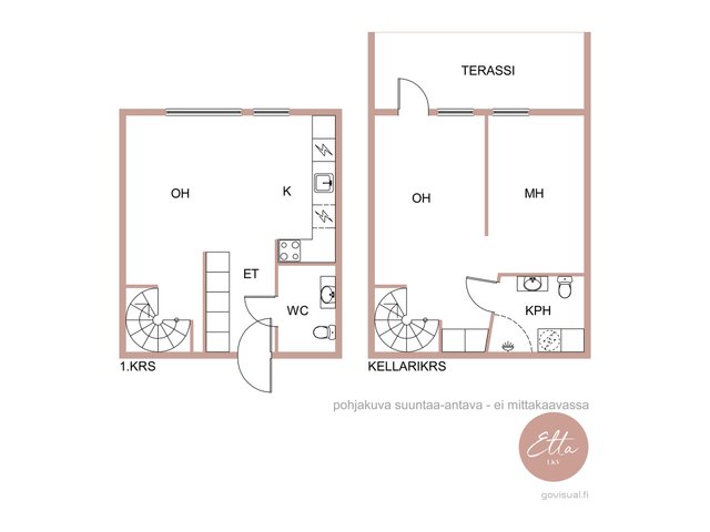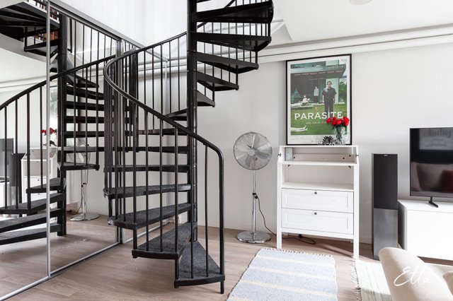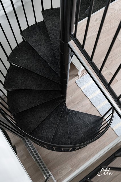 Asunnon tulokerroksessa sijaitseva avokeittiö ja ruokailutila muodostavat kodin sydämen. Avointa tilaa on helppo muokata omiin tarpeisiin: halutessasi voit luoda siihen etätyöpisteen tai keittiön kanssa yhtenäisen oleskelutilan, jossa voi nauttia aamuhetkistä kahvikupin äärellä tai viettää iltaa ystävien seurassa. Kierreportaat johdattavat alakertaan, jossa kodin tunnelma syvenee – pehmeä valo, näkymät pihalle ja tilava aulatila, joka toimii erinomaisesti olohuoneena tai tarpeiden mukaan muokkautuu työhuoneeksi. Makuuhuone on mukavan suojaisa ja peililiukuovien taakse kätkeytyy paljon säilytystilaa. Molemmissa kerroksissa sijaitsevat wc:t tuovat arkeen helppoutta. Ja kun astut alakerrasta ulos, sinua odottaa oma piha – paikka, jossa voit kasvattaa yrttejä tai vain nauttia kesäilloista.