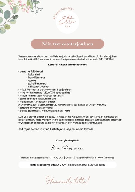 Tämä kahteen kerrokseen jakautuva 49 m²:n koti Raision Viheriäisissä tarjoaa jotain aivan muuta kuin perinteisen kerrostaloasunnon. Ainutlaatuinen kokonaisuus, jossa yhdistyvät kerrostaloasumisen helppous ja rivitalomaisen kodin tunnelma. Alakerran oma, suojaisa ja aidattu piha tekee asumisesta viihtyisää, ja tarjoaa yksityisen ulkotilan arjen ja vapaa-ajan viettoon. Tämä koti on täydellinen sinulle, joka arvostat persoonallisuutta!