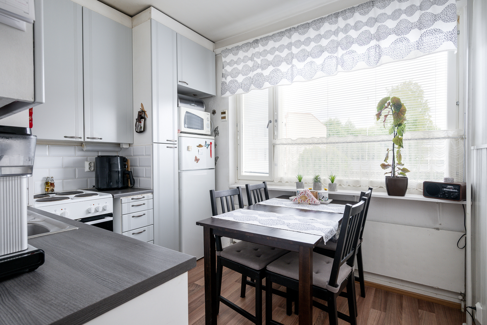 Olohuone on iso ja valoisa, ja sinne mahtuu hyvin isokin oleskeluryhmä. Makuuhuone on tilava ja rauhallinen, ja keittiö tarjoaa toimivat puitteet niin arkeen kuin viikonlopun kokkailuhetkiin. Kylpyhuoneessa on tilaa myös pesukoneelle.