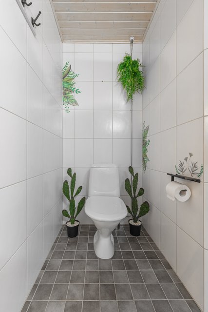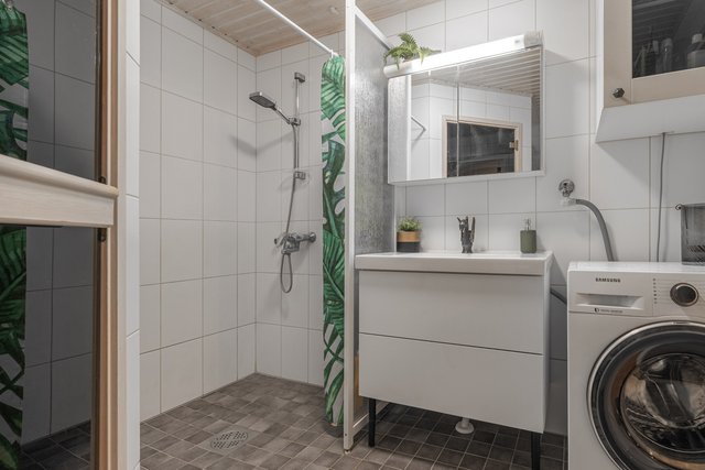 - WC-istuin, suihku, suihkuseinä, peilikaappi, pesukoneliitäntä, ja pesuallas