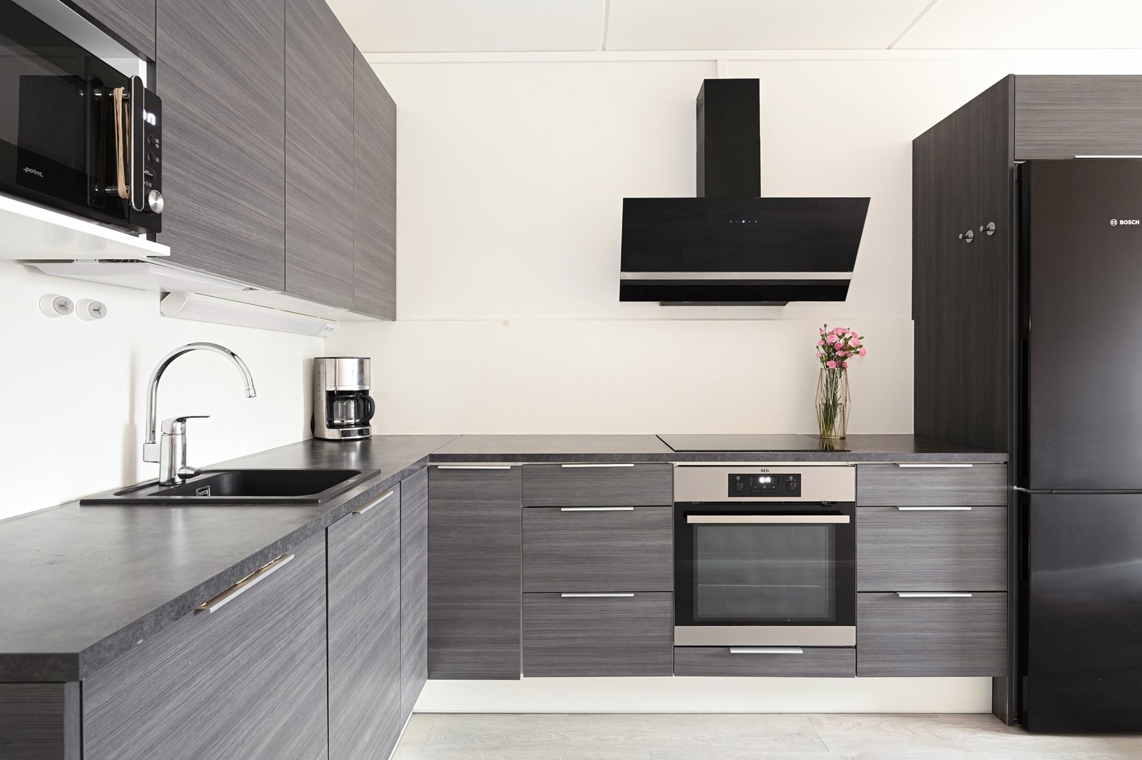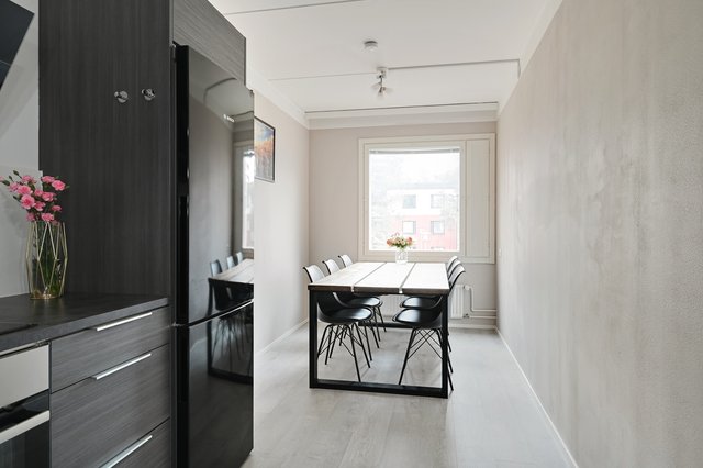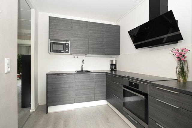 - Jääkaappipakastin, induktioliesi, uuni, astianpesukone, liesituuletin. Työtasot: laminaatti. Lattia: vinyylilankku. Seinät: maalattu.