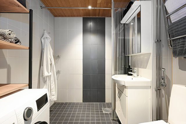 - kylpyhuone uusittu linjasaneerauksen yhteydessä 2014. Suihku, suihkuseinä, wc-istuin, peilikaappi, allaskaappi, pesukoneliitäntä, rättipatteri, lattialämmitys. Lattia: laatta. Seinät: kaakeli.