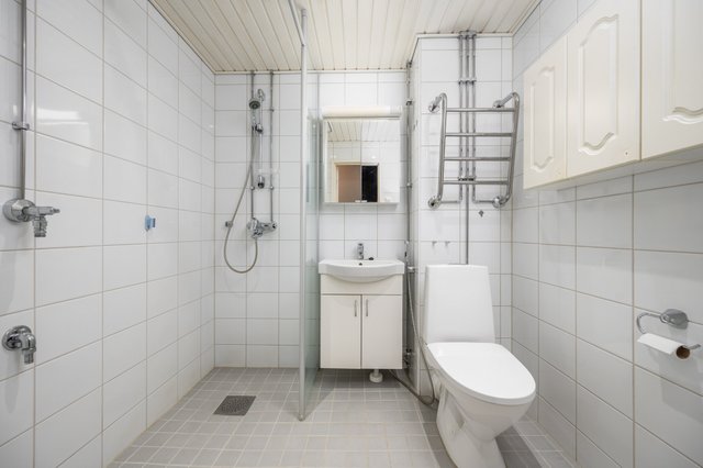 - Pesukoneliitäntä, wc-istuin, suihku, peilikaappi, pesuallas, allaskaappi, bidee-suihku, suihkuseinä, ja pyyhekuivain