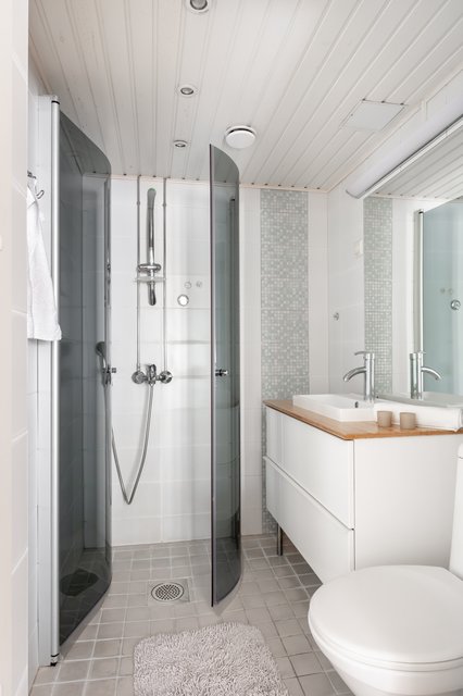 - VARUSTUS: Suihku, suihkuseinä, wc-istuin, hana, pesuallas, lattialämmitys, allaskaluste, peili, kiinteä valaisin. SEINÄT / LATTIA: Laatta.