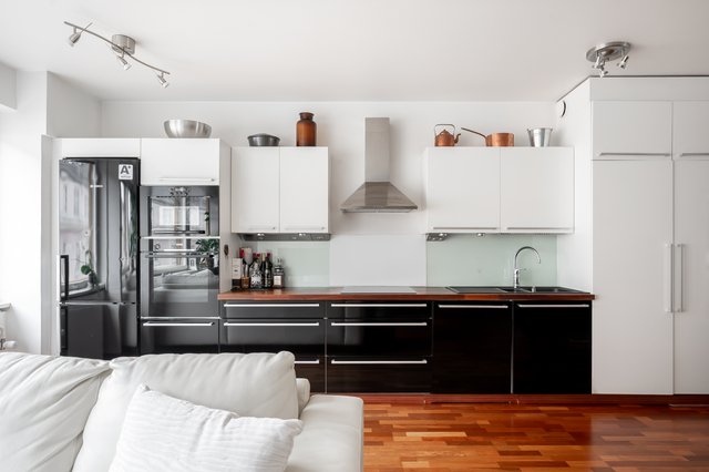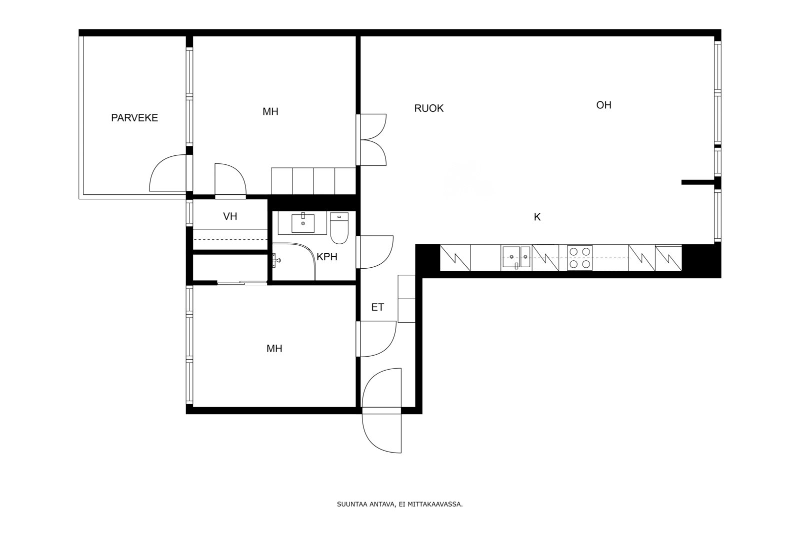 - VARUSTUS: Induktioliesi, liesituuletin, integroitu uuni, integroitu mikroaaltouuni, hana, kaapisto, pesuallas, integroitu astianpesukone, jääkaappipakastin, kiinteät valaisimet. SEINÄT: Maali. VÄLITILA: Lasi. LATTIA: Parketti.