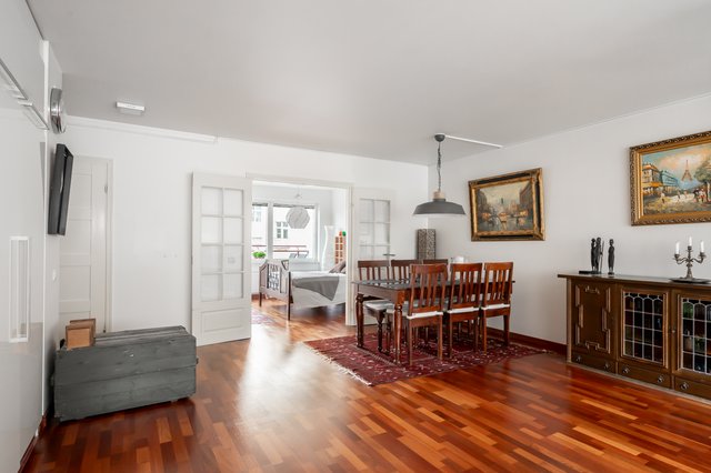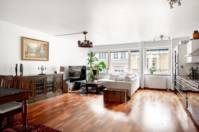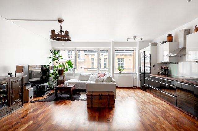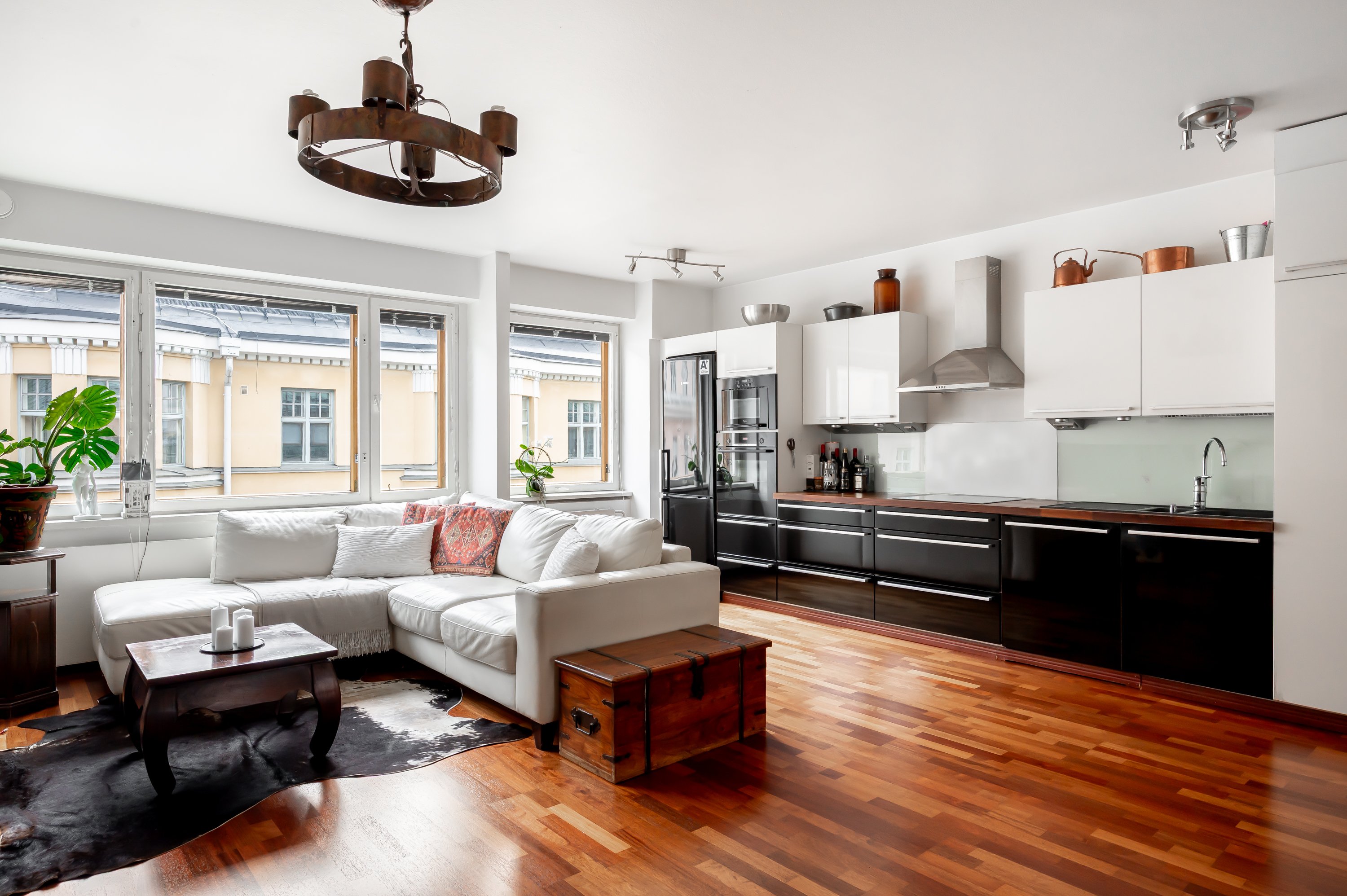 Asunnon sydän on tilava olohuoneen, ruokailutilan ja keittiön muodostama kokonaisuus, jossa on runsaasti tilaa sekä arkeen että yhdessäoloon. Keittiössä on moderni ilme ja hyvät työskentelysekä säilytystilat. Olohuoneesta avautuvat näkymät kadun puolelle, ja suuret ikkunat tuovat runsaasti luonnonvaloa.
