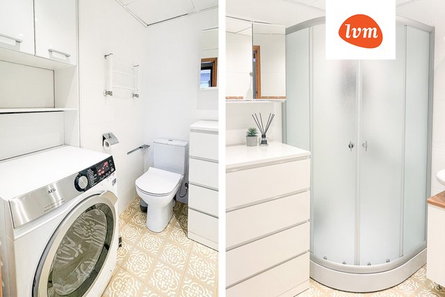 - WC-istuin, suihku, suihkukaappi, pesukone, peilikaappi, peili, allaskaappi, ja pesuallas