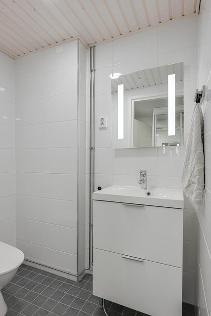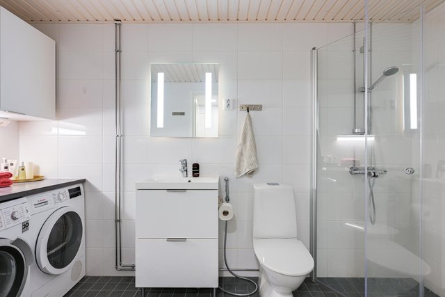 - Pesukoneliitäntä, lattialämmitys, suihku, suihkuseinä, peili, ja kylpyhuonekaapisto, allaskaappi