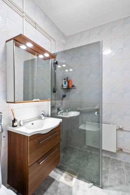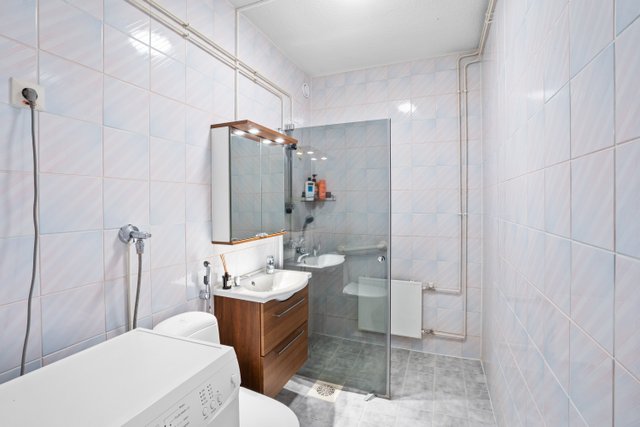 - Pesukoneliitäntä, pesuallas, peilikaappi, wc-istuin, suihkuseinä, ja bidee-suihku