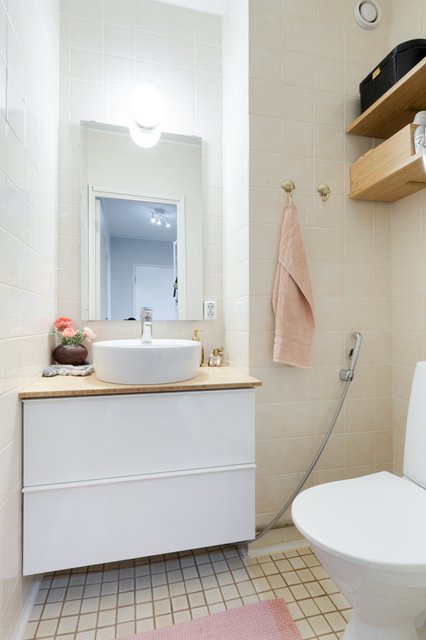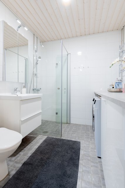 - Varustus: suihku, wc-istuin, allaskaappi, peilikaappi, pesukoneliitäntä, lattialämmitys, kaapistot, kiinteät valaisimet, pyyhekuivain ja työtasot. Lattia- ja seinäpinnat laatoitettu.