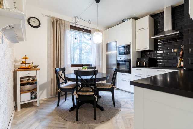 Asunnon hyvin suunniteltu pohjaratkaisu palvelee erinomaisesti myös isompaa perhettä – neliöt jakautuvat tasaisesti ja huoneet ovat tilavia. Keittiö on uusittu vuonna 2016 ja se on edelleen ajanmukainen ja erinomaisessa kunnossa. Varusteluun kuuluu muun muassa keraaminen liesi ja integroitu mikro.