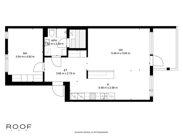 - Huoneiston pinta-ala on yhtiöjärjestyksen, isännöitsijäntodistuksen ja myyjän ilmoituksen mukaan 65,50 m2. Pinta-alaa ei ole tarkistusmitattu. Edellä mainittu pinta-ala saattaa tämän ikäisessä kohteessa poiketa olennaisestikin huoneiston nykyisen ja rakentamisaikaisen mittaustapojen ja standardien mukaan laskettavasta pinta-alasta. Huoneiston todellinen pinta-ala voi siis olla yhtiöjärjestyksessä, isännöitsijäntodistuksessa ja esitteessä mainittua pienempi tai suurempi. Kohteen markkinoinnissa käytetään mittatiedoilla varustettua pohjapiirrosta. Pohjapiirroksen tarkoitus on helpottaa ostajan ostopäätöstä ja selvittää asunnon nykyinen huonejako. Lukija on tietoinen, että pohjakuva on suuntaa