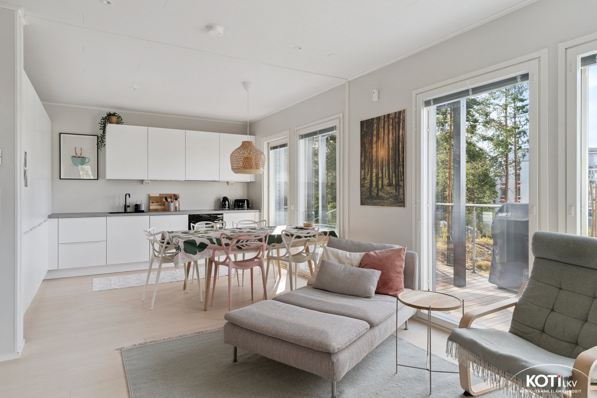- Olohuone ja avokeittiö muodostavat kodin sydämen - valoisan ja avaran tilan, jossa on helppo viihtyä yhdessä perheen ja ystävien kanssa. Suuret ikkunat tuovat runsaasti luonnonvaloa ja avaavat näkymät sekä olohuoneeseen että ruokailutilaan. Keittiöstä on suora kulku suurelle terassille, joka jatkaa oleskelutiloja ulos saakka ja tarjoaa täydelliset puitteet kesäpäivien viettoon.