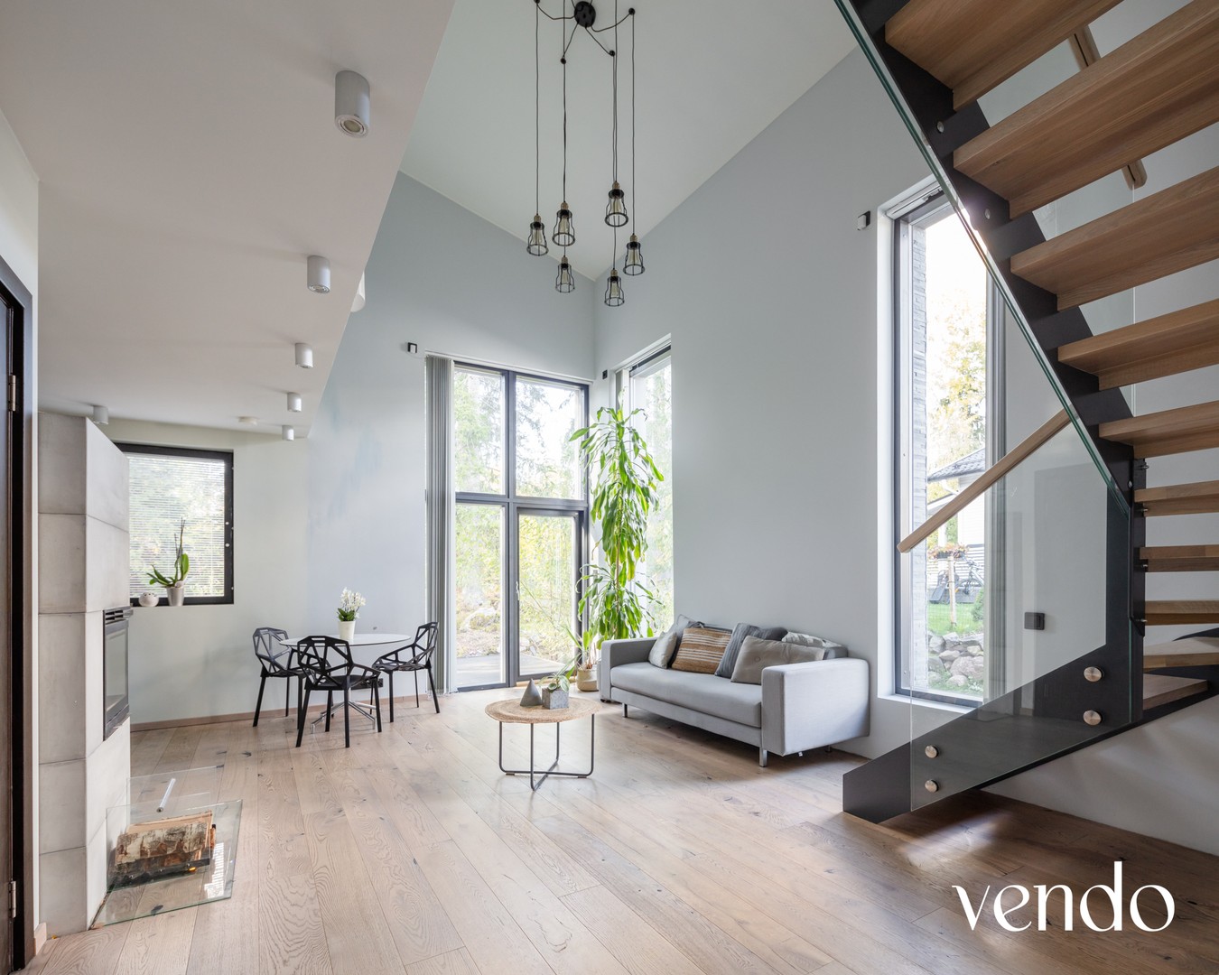 - Takka, sisäportaat (tammea, lasikaiteet), maalatut ja taidemaalatut seinät ja vinyylilattia, Timberwisen tammiparkettilattia