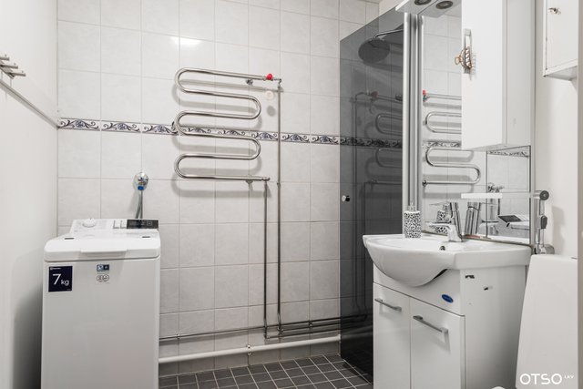 - Suihku, suihkuseinä, pesukoneliitäntä, lattialämmitys, allaskaappi, peilikaappi, ja bidee-suihku