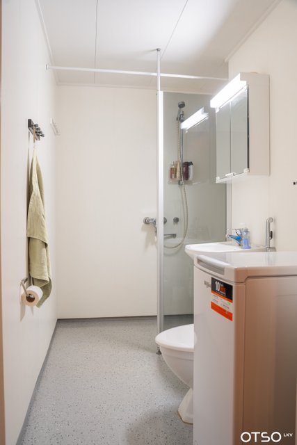 - WC-istuin, suihku, suihkuseinä, bidee-suihku, pesuallas, peilikaappi, ja pesukoneliitäntä