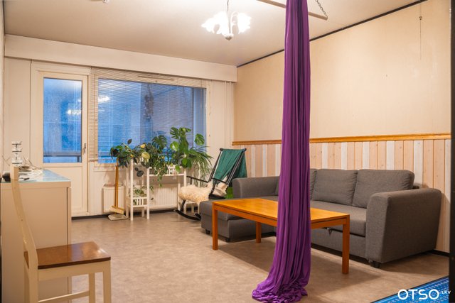 Väljään olohuoneeseen tulvii luonnonvalo, ja sieltä avautuu käynti lasitetulle parvekkeelle.