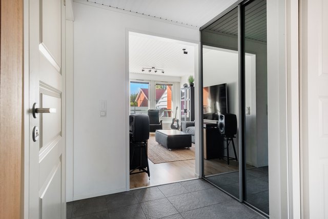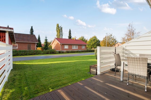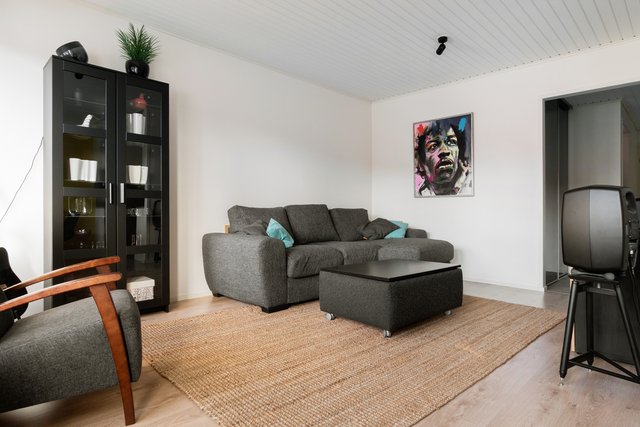 Valoisa olohuone ja keittiö muodostavat yhtenäisen oleskelutilan, joka jatkuu oleskelupihalle. Tilat toimivat hyvin arjessa ja kutsuvat viettämään aikaa yhdessä perheen ja ystävien kanssa.