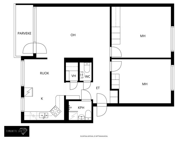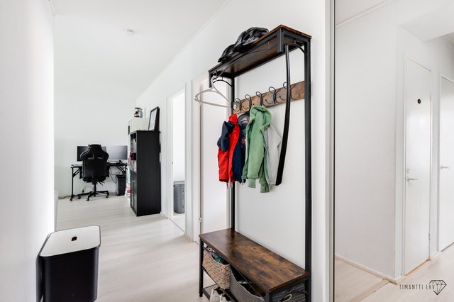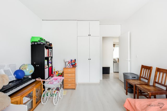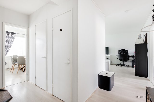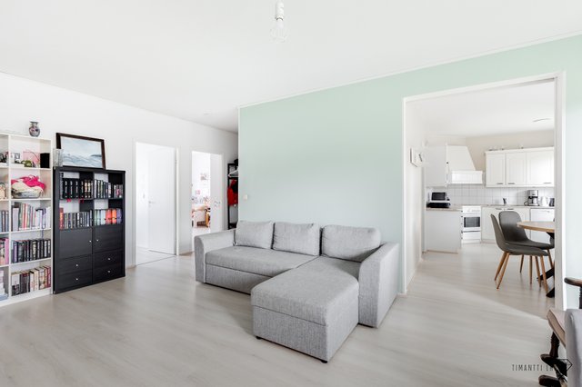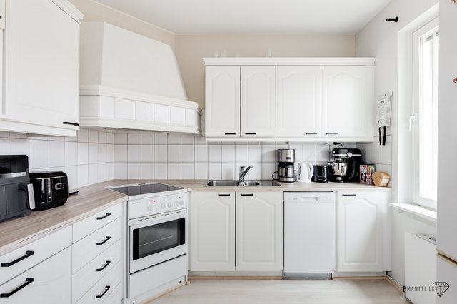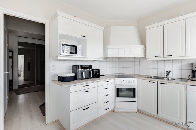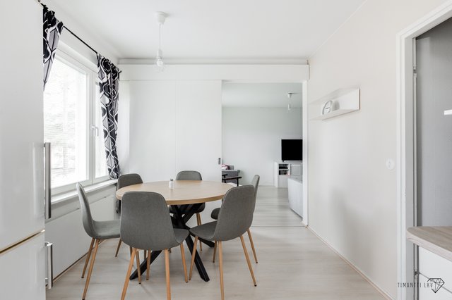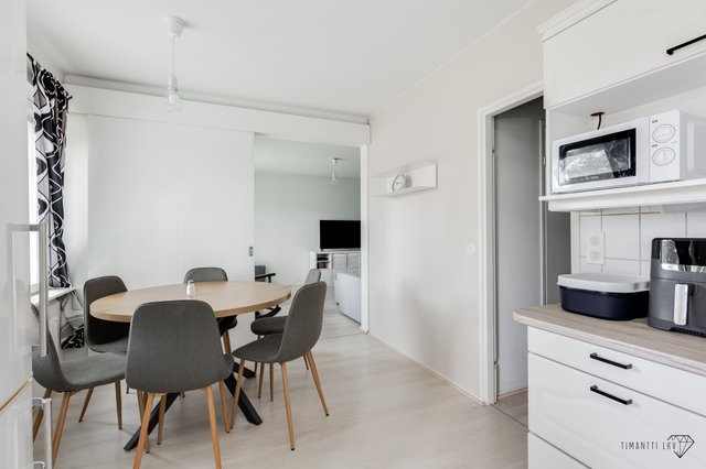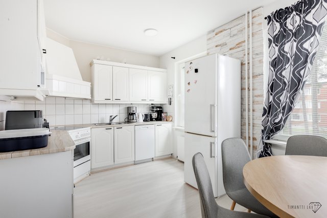 Tässä asunnossa on erinomaiset tilat ja toimiva pohjaratkaisu. Tilavassa ja remontoidussa keittiössä on runsaasti kaappitilaa ja paikka isommallekin ruokapäydälle