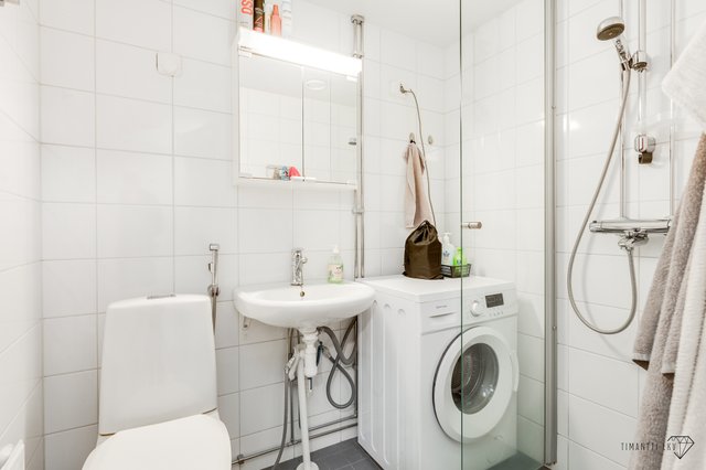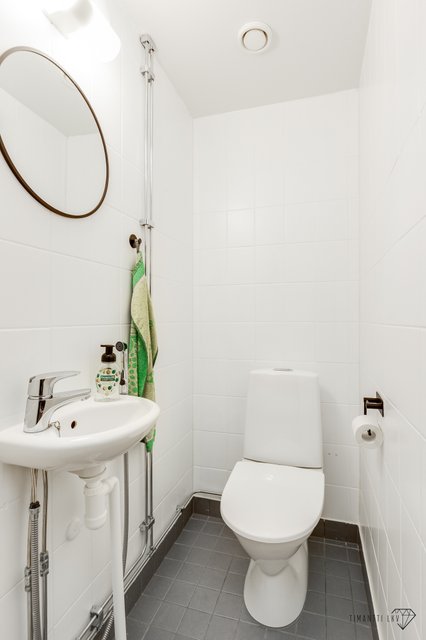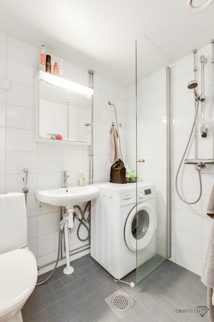 - WC-istuin, suihku, suihkuseinä, lattialämmitys, peilikaappi, pesuallas, ja bidee-suihku