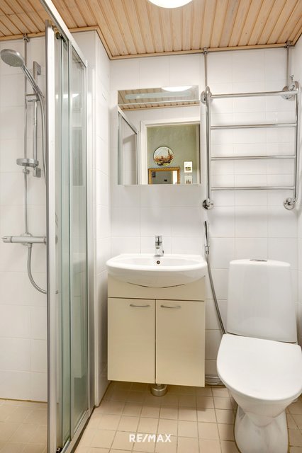 - WC-istuin, suihku, suihkuseinä, pesukoneliitäntä, lattialämmitys, allaskaappi, peilikaappi, pesuallas, ja bidee-suihku