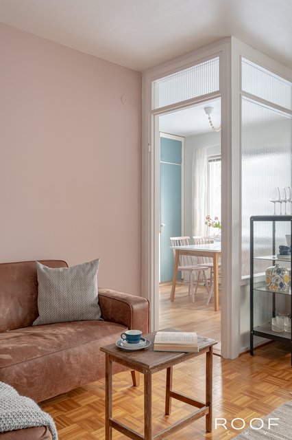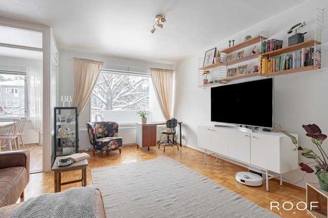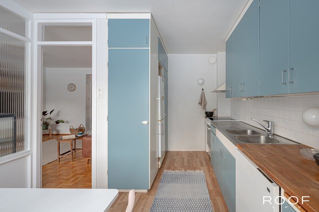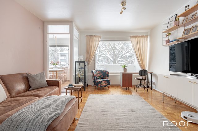 Asunnossa on kaksi makuuhuonetta, valoisa olohuone sekä tilava keittiö, jonne mahtuu mukavasti neljän hengen ruokapöytä. Keittiöstä löytyy niin lasku- kuin säilytystilaa ja mikä ihaninta, käynti lasitetulle parvekkeelle, mikä tuo kesäisin aamukahvihetkiin luksusta.