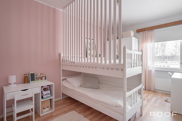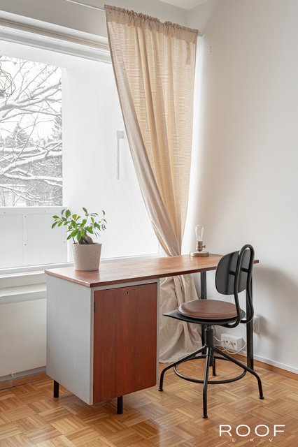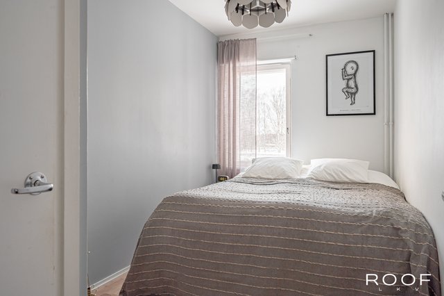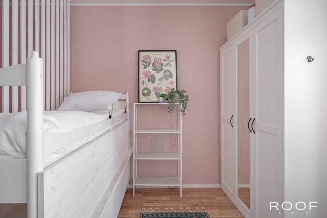 - Asunnossa on kaksi hyvänkokoista makuuhuonetta vierekkäin. Molemmissa huoneissa on suuret ikkunat kadun suuntaan sekä vaatekaapit, jotka lisäävät hyvin säilytystilaa.