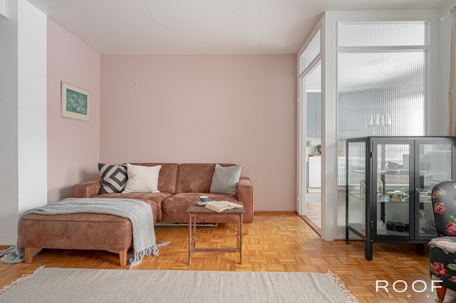 - Tilavan, parkettilattiaisen olohuoneen ja keittiön välissä on osittainen lasiseinä. Olohuoneen päädyssä on lasitettu parveke, jonne kulku tapahtuu keittiön kautta.