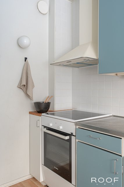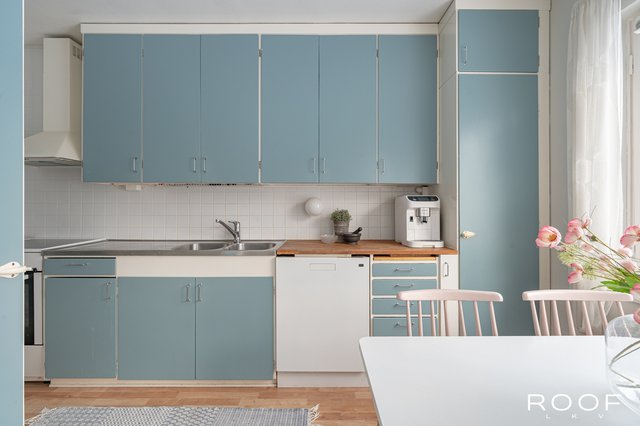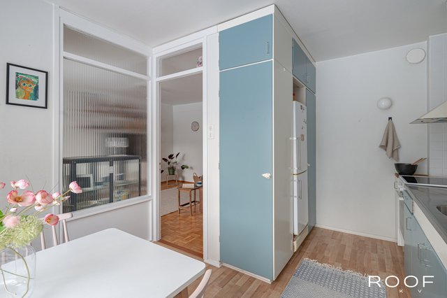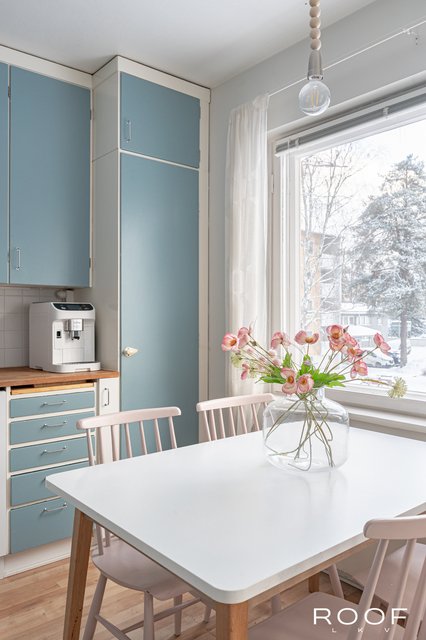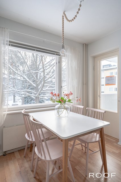 - Valoisassa ja tilavassa keittiössä ruokailupöytä mahtuu mukavasti ikkunan alle, ja tästä on suora kulku parvekkeelle.