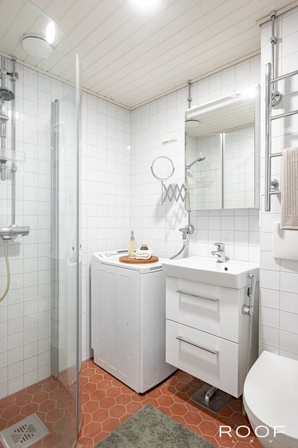 - WC-istuin, suihku, suihkuseinä, pesukoneliitäntä, lattialämmitys, peilikaappi, pesuallas, allaskaappi, ja bidee-suihku