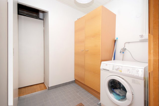 Asunnossa on myös pieni kodinhoitohuone, johon saa kätevästi vaikka pesutornin tai vauvanhoitonurkkauksen. Sisäpihassa on puistoalueeksi kaavoitettu metsäalue.