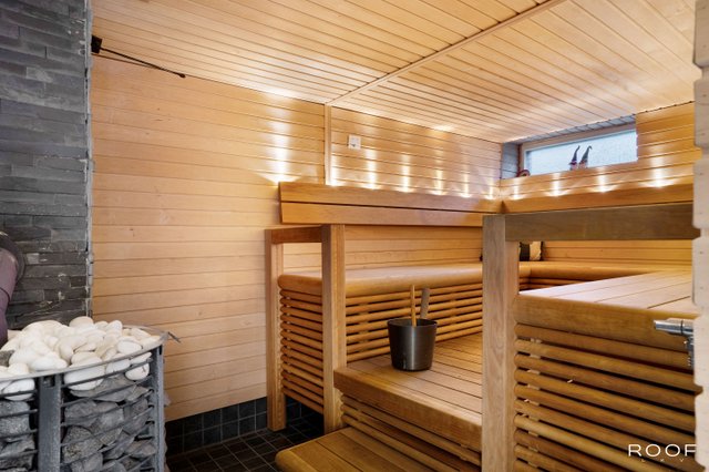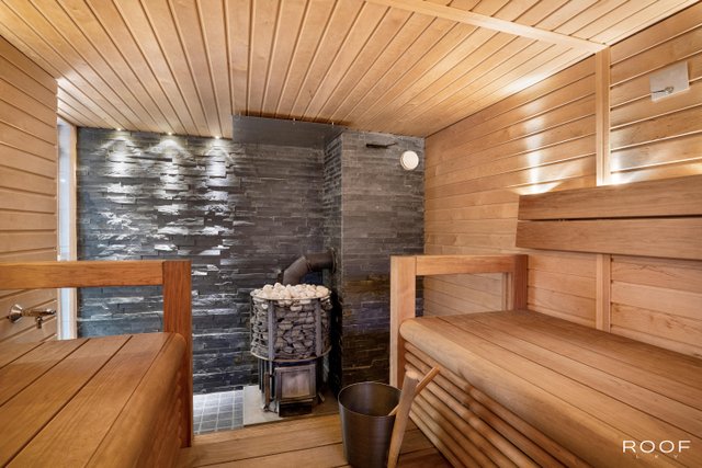 - Varustus: kiuas, lauteet, kylmävesiliitäntä Seinät ja katto: tervaleppäpaneeli Lauteet: lämpökäsitelty haapa Lattia: laattalattia Lisätiedot: epäsuora LED-valaistus, ikkunallinen sauna, tilavat kaksitasoiset lauteet