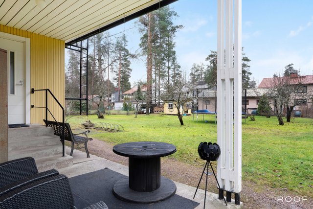 Oma 1 000 m² tontti on tasainen ja vehreä. Sisäänkäynnin yhteydessä on katettu terassi, ja pihapiiriä elävöittävät istutukset sekä hedelmäpuut.